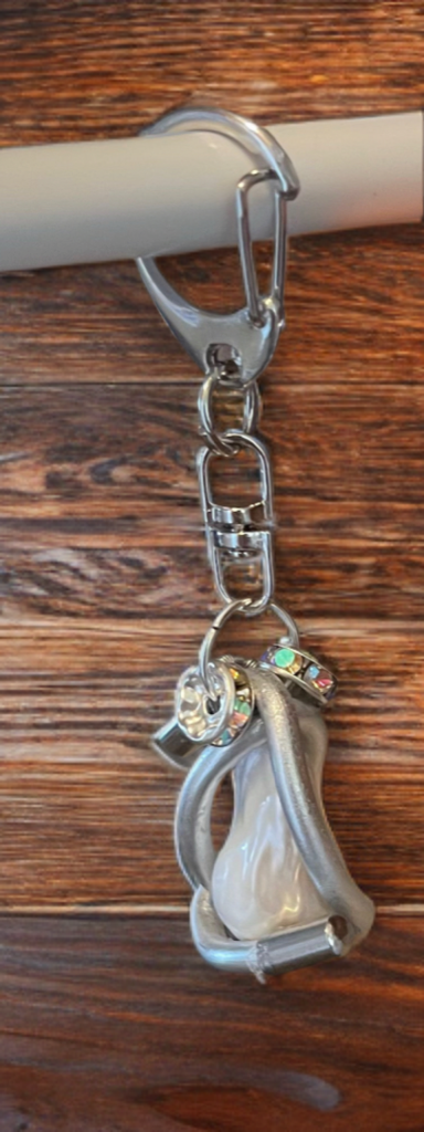 Accented with soft-colored crystal rings, this charm brings a subtle sparkle that complements the organic beauty of the pearl. Its versatile design makes it perfect as a keychain or as a stylish clip-on accessory for purses, handbags, backpacks, or totes—adding an elegant finishing touch to any look.