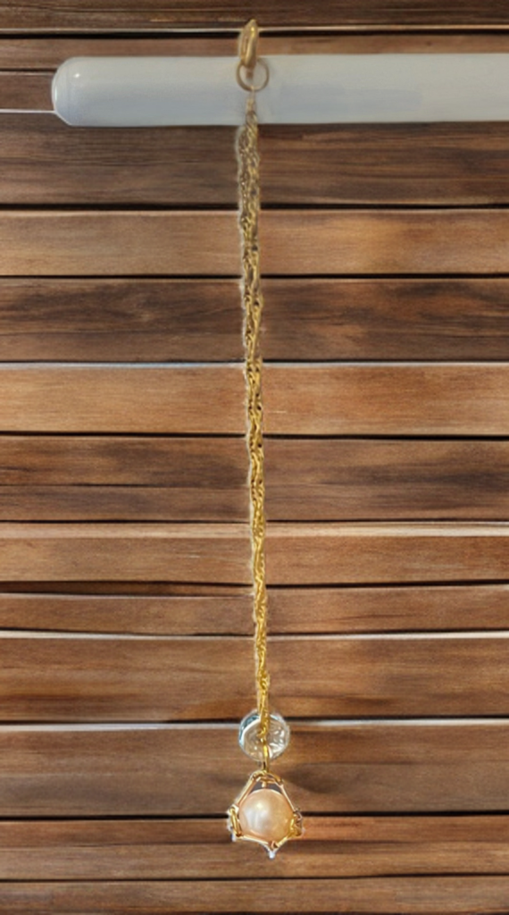A brilliant light blue crystal accent sits above the pearl, offering a subtle yet striking contrast. The pendant is suspended from a gold-toned chain, measuring 7 inches (medium size), and secured with a classic clasp for everyday wear.