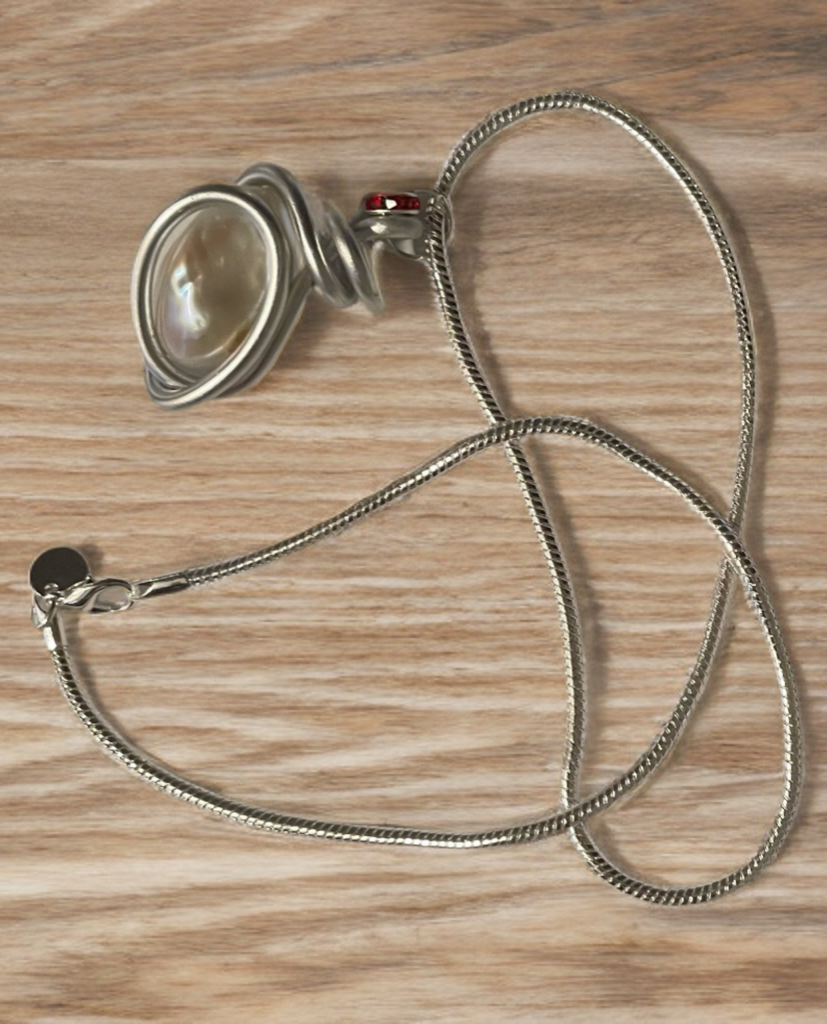 Graceful, distinctive, and full of character, this necklace showcases a luminous baroque pearl cradled within a handcrafted silver-toned bar link cage. The organic curves of the pearl are embraced by smooth, artistic metalwork, creating a modern yet timeless statement. A ruby-colored crystal ring adds a subtle pop of rich color, lending sophistication and a hint of romance to the design.