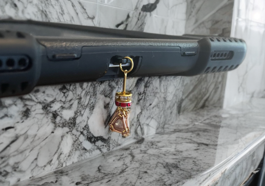 Above the pearl, twin spacer rings sparkle with clear and ruby-red crystals, creating a striking contrast of light and color. The charm attaches securely to any device’s USB-C port via a discreet black connector, offering both protection from dust and a stylish personal accent.