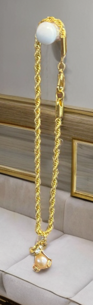 - Materials: Gold-toned chain, pearl centerpiece, crystal accent