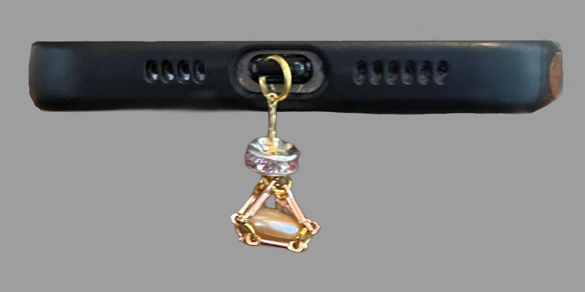 Add a whisper of elegance to your tech with this delicate charm, featuring a petite baroque button pearl whose natural luster catches the light with every movement. The pearl is artfully encased in a handcrafted gold-toned bar link cage, its warm metallic finish lending a refined, artisan touch. Above, a soft pink crystal spacer offers a gentle pop of color, bringing a romantic sparkle to the design. Perfectly sized to adorn and accessorize your USB Lightning port, this piece transforms your device into a statement of personal style.